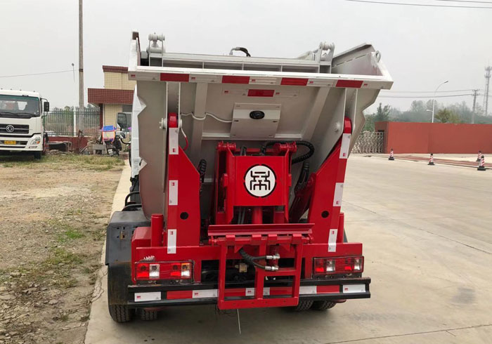 4.舉升箱體,進(jìn)行卸料。采用高位舉升自卸結(jié)構(gòu),操作方便實(shí)用??芍苯有读稀⑴c壓縮式垃圾車對接、與移動式壓縮箱進(jìn)行對接卸料。車輛尾部裝有液壓支腿,保證卸料作業(yè)的平穩(wěn)性與安全性。