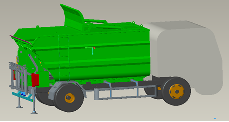 2.垃圾桶自動升起倒入箱體,落下垃圾桶,刮板開始刮料。采用后裝刮板壓縮技術(shù),對生活垃圾大幅度壓縮減容。箱體頂部裝有刮板,在壓縮過程中,推板在推板油缸的作用下,向后進行壓縮垃圾。由于刮板設(shè)計與箱體底板有小間隙,保證垃圾進料干凈、壓縮實在,從而加大垃圾裝載量。壓縮比可達1:1.5以上,生活垃圾經(jīng)壓縮后可達到500~700Kg/m3以上。