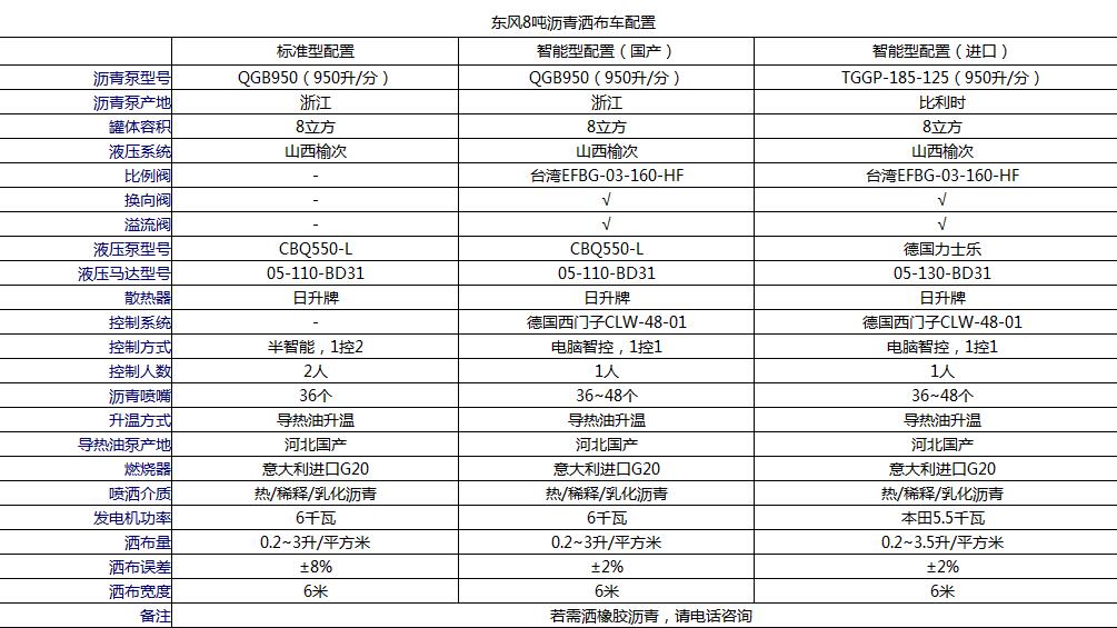 **好用的系統(tǒng) 1.手動(dòng)/自動(dòng)**噴灑量和作業(yè)寬度,每個(gè)噴嘴可單獨(dú)**,進(jìn)行行列式噴嘴自由組合,從而實(shí)現(xiàn)任意調(diào)節(jié)噴灑的寬度。可在駕駛室或車尾平臺(tái)進(jìn)行灑布**。 2.自動(dòng)**系統(tǒng)可以測(cè)量車速并根據(jù)輸入的灑布量和噴灑寬度及瀝青種類,進(jìn)行自動(dòng)計(jì)算瀝青泵轉(zhuǎn)數(shù)再通過(guò)系統(tǒng)自動(dòng)調(diào)整瀝青泵的泵數(shù)。 3.車載式快速加熱系統(tǒng)(10—15℃/h),可提高加熱效率并減少施工**時(shí)間,確保灑布溫度; 4.沖噴嘴此系統(tǒng)可將噴嘴剩余瀝青通過(guò)柴油加高壓空氣吹出,防止瀝青凍結(jié)于噴嘴,提高噴嘴使用壽命。 **好的零件 5.整車關(guān)鍵部分的零部件(液壓泵、液壓馬達(dá)、瀝青泵、比例閥、自動(dòng)**系統(tǒng))等采用國(guó)際知名**好的元件,有效延長(zhǎng)使用壽命; 6.采用國(guó)際**的高粘度瀝青泵,可將外部瀝青,泵入罐內(nèi),實(shí)現(xiàn)“自吸”,也可將罐內(nèi)瀝青,泵出; 7.加熱系統(tǒng)使用意大利進(jìn)口燃燒器,具有自動(dòng)點(diǎn)火和溫度**功能; 個(gè)性化設(shè)備 8.所有熱管外部均有隔熱保溫層,降低散熱量的同時(shí)避免燙傷操作人員; 9.瀝青噴灑桿采用三段折疊式結(jié)構(gòu),通過(guò)上下移動(dòng)灑布桿可以實(shí)現(xiàn)雙重或多重噴灑,通過(guò)左右移動(dòng)灑布桿可以擴(kuò)大灑布范圍,而且可以有效地避開障礙物; 10.瀝青罐體內(nèi)部設(shè)有沉淀排污槽,并裝有液位顯示器和報(bào)**、安全裝置; |