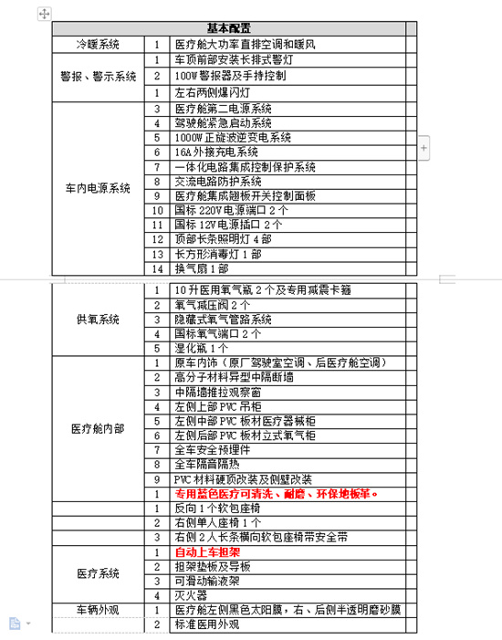 醫(yī)療艙按程力救護車廠監(jiān)護型救護車標(biāo)準(zhǔn)改裝。該款救護車適用于適合于國內(nèi)外各級醫(yī)療機構(gòu),為城際救治、監(jiān)護和轉(zhuǎn)運急危重癥病人而設(shè)計的救護車
