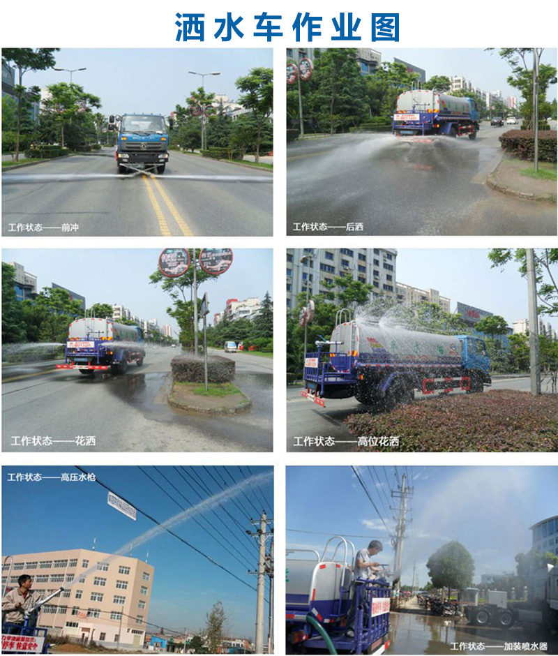 灑水車標配 | 前沖,后灑,側(cè)噴,高壓水**,吸水管,全套噴頭 | ||