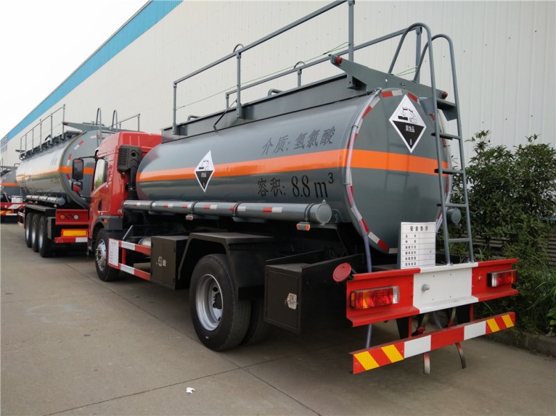 | 其他 | 該車(chē)適用于危險(xiǎn)品運(yùn)輸。運(yùn)輸介質(zhì)品名:次氯酸鈉,液堿,氫氯酸,硫酸,氨水,密度分別為:1050千克/立方米,1040千克/立方米,1047千克/立方米,1045千克/立方米,990千克/立方米;類項(xiàng)號(hào):8;罐體有效容積:8.8立方米,罐體外形尺寸(長(zhǎng)×直徑)(mm):5200×1600。隨底盤(pán)選裝平頂駕駛室。防護(hù)材料:Q23**碳鋼,連接方式:左右側(cè)面及后部防護(hù)均采用焊接連接,后部防護(hù)斷面尺(mm):140×50, 后部防護(hù)離地高度(mm):450。僅采用底盤(pán)子午線輪胎型號(hào)(9.00R20 16PR,10. | ||